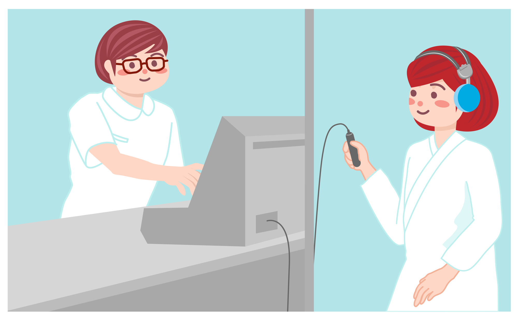 周囲の音の影響を受けないよう、防音室または静かな検査室に入ります。 - ヘッドフォンを装用し、ボタンスイッチを持つ